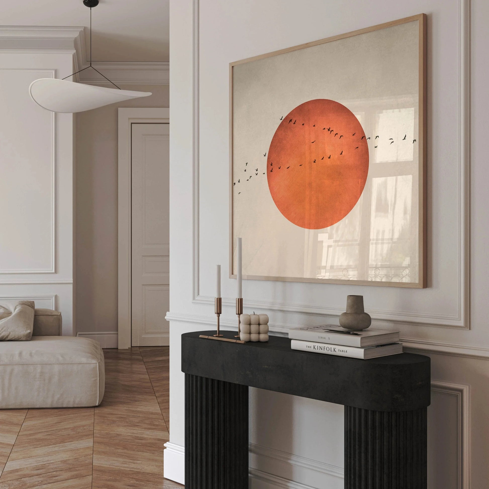 Add visual interest to your space with this square canvas print featuring a moon and birds landscape scene.