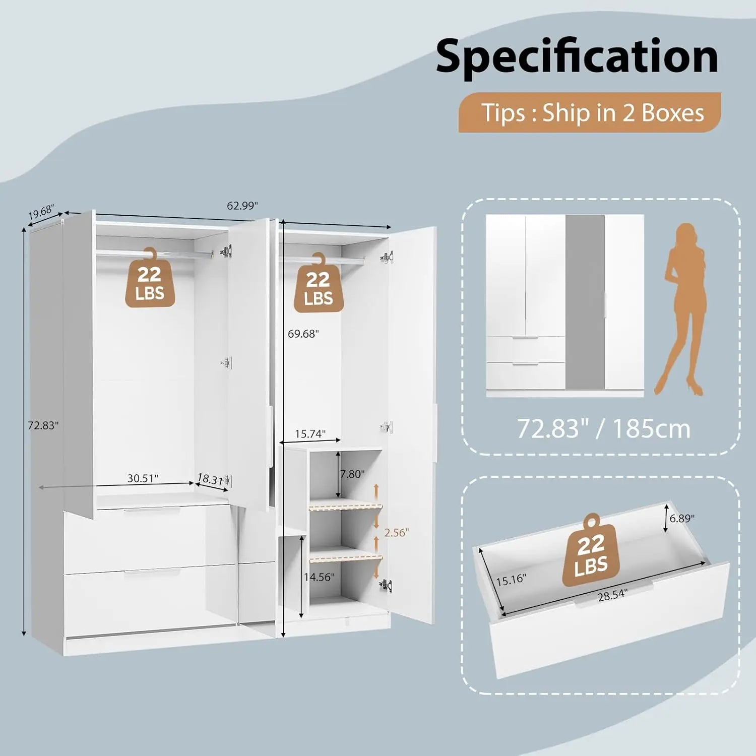 - Includes: Mirror doors, drawers