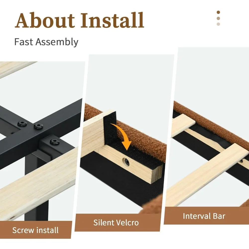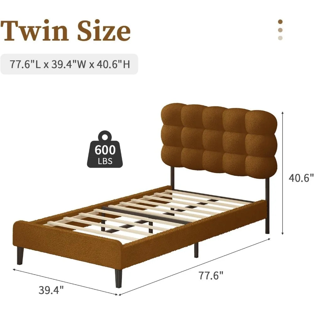 Single Bed Frame with Upholstered Headboard, Teddy Soft Boucle Fabric, Platform Bed with Strong Wooden Slats Support, Tw