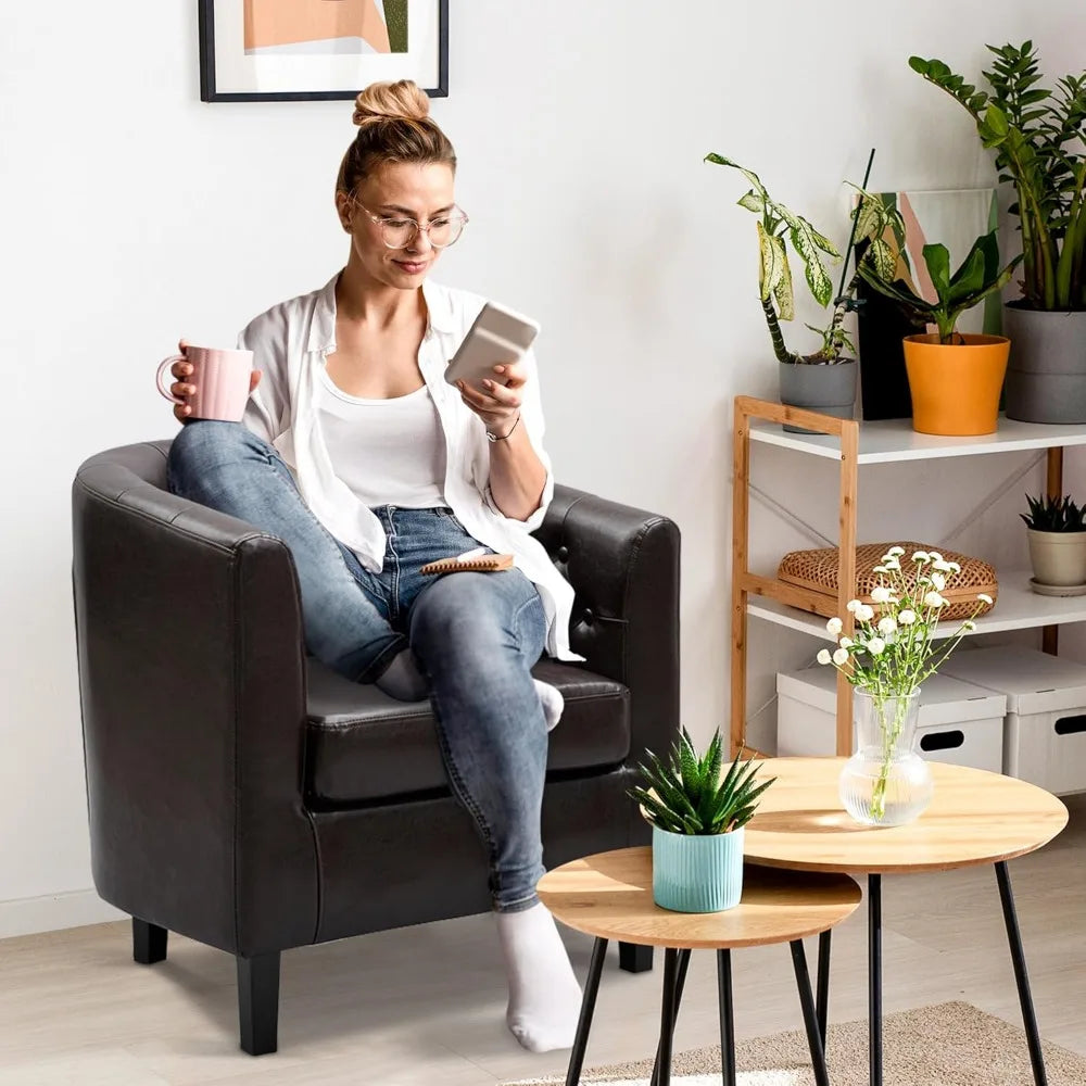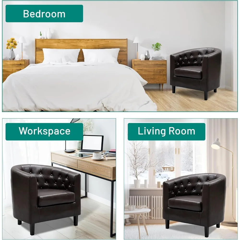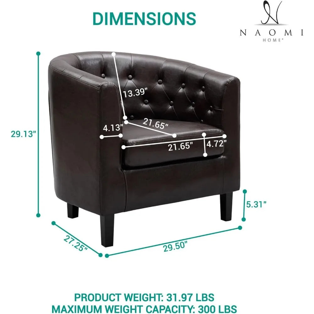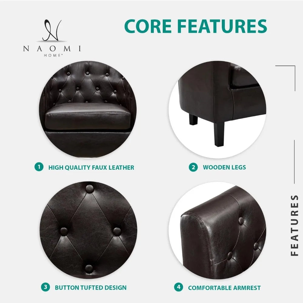 Emma Accent Chair, Button Tufted Faux Leather Barrel Chair, Midcentury Modern Accent Chair Comfy Armchair, Tub Barrel Chairs for