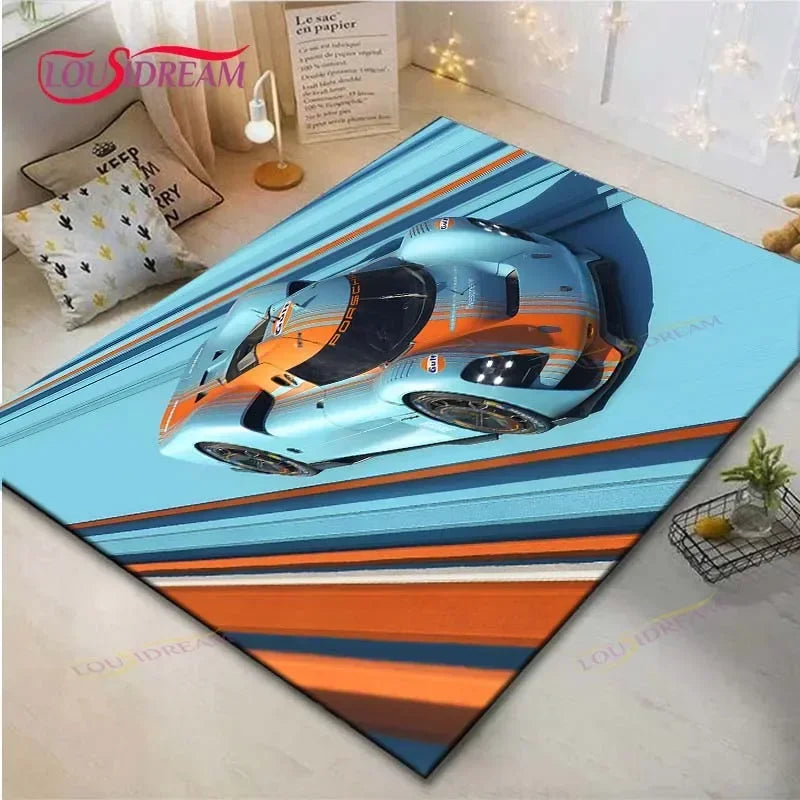 This eye-catching rug combines racing style with practical function, making it an ideal addition for anyone who loves motorsport culture and bold design.