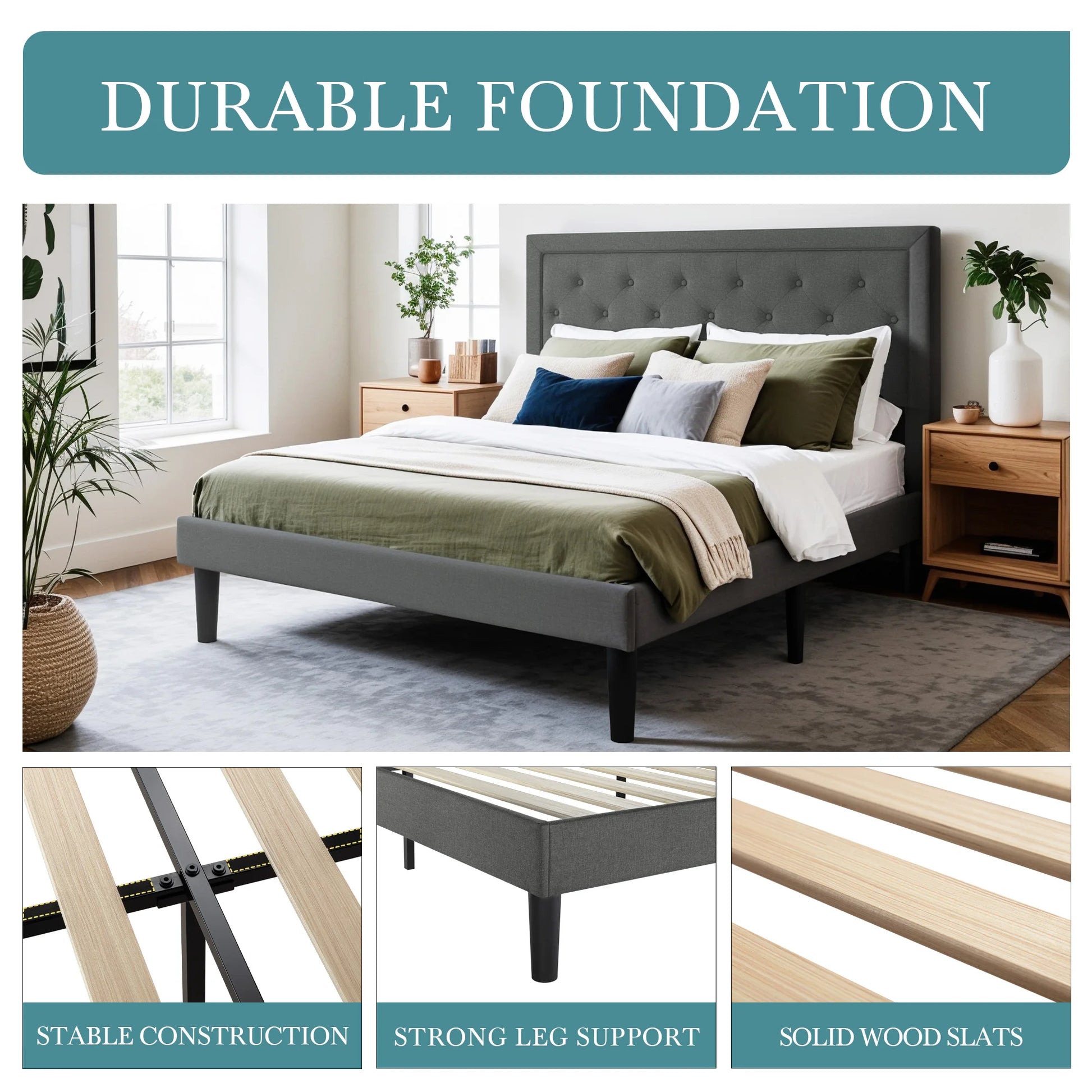 Queen Size Upholstered Platform Bed Frame with Button Tufted Linen Headboard