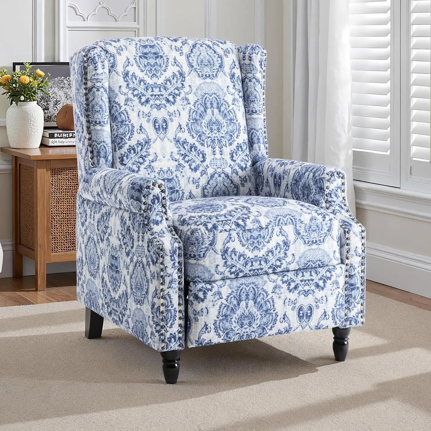 Pushback Recliner Chair, Floral Fabric Wingback Recliner Chair, Upholstered Armchair Push Back Recliner, Rivet Trim S