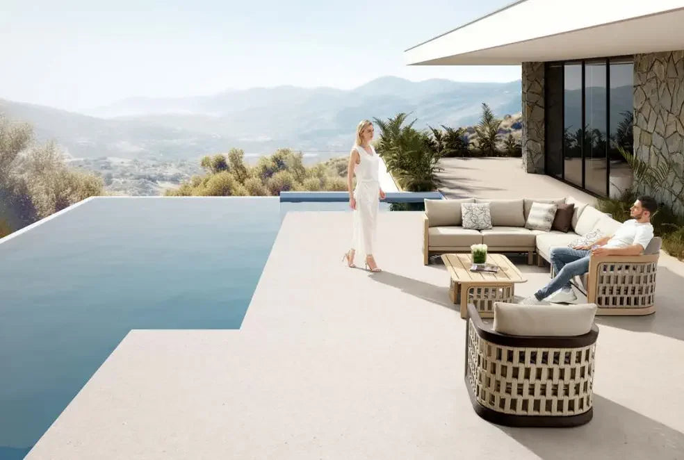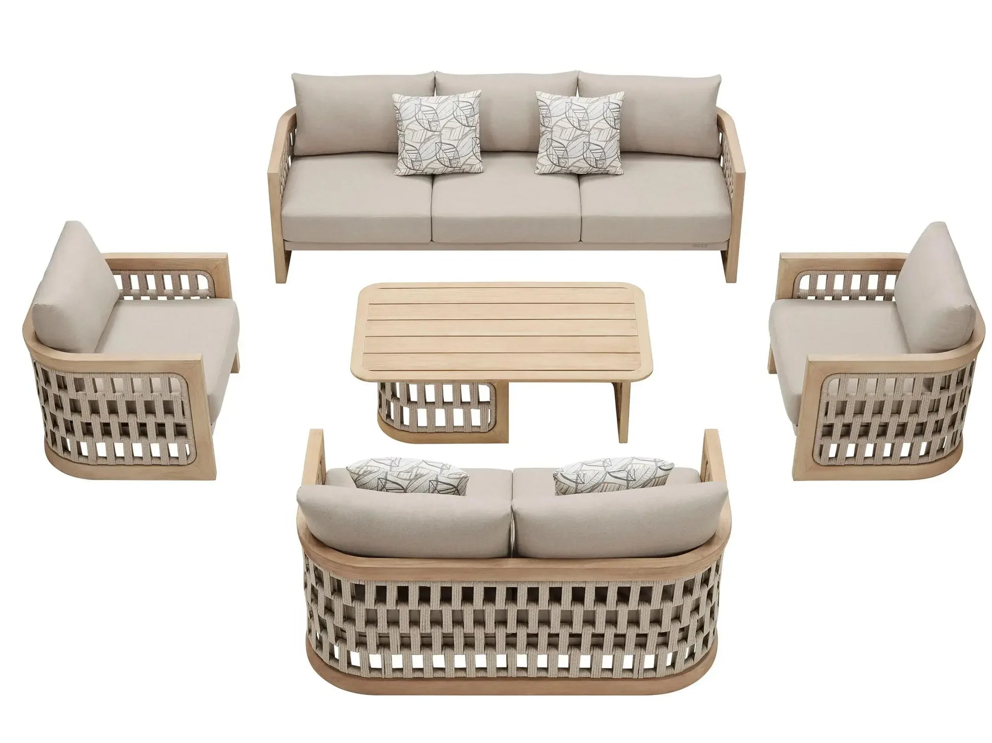 Hot Sales Outdoor Luxury Terrace Set Rope Weave Natural Teak Wood Sofa With Combination Of Strapping Patio Garden And Cushion V