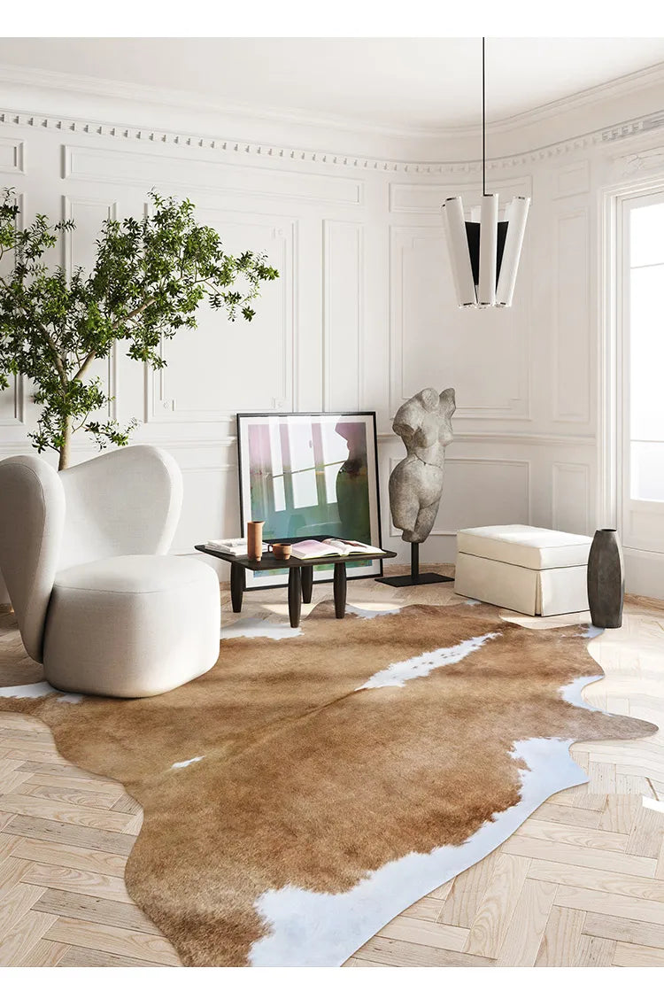 The organic shape and realistic cowhide pattern create visual interest while bringing warmth and character to modern, farmhouse, or eclectic interiors.