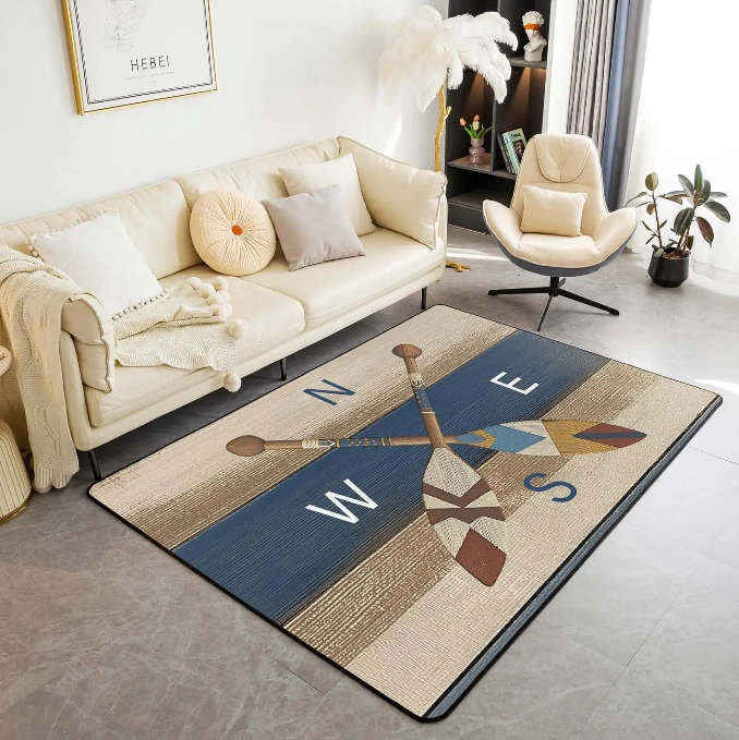 The monochrome brushstrokes pair beautifully with minimalist Scandi, industrial lofts, or contemporary spaces—add leather furniture and metallic accents. The orange and yellow strokes bring energy to eclectic, bohemian, or mid-century modern interiors—pair with plants and warm woods. The camping design works perfectly in adventure-themed rooms, kids' spaces, or vacation homes. The blue circular motion complements coastal, contemporary, or artistic interiors. The nautical compass anchors beach houses, boys' rooms, or travel-inspired spaces. The yellow terrazzo adds playful sophistication to modern, Memphis-style, or maximalist rooms.