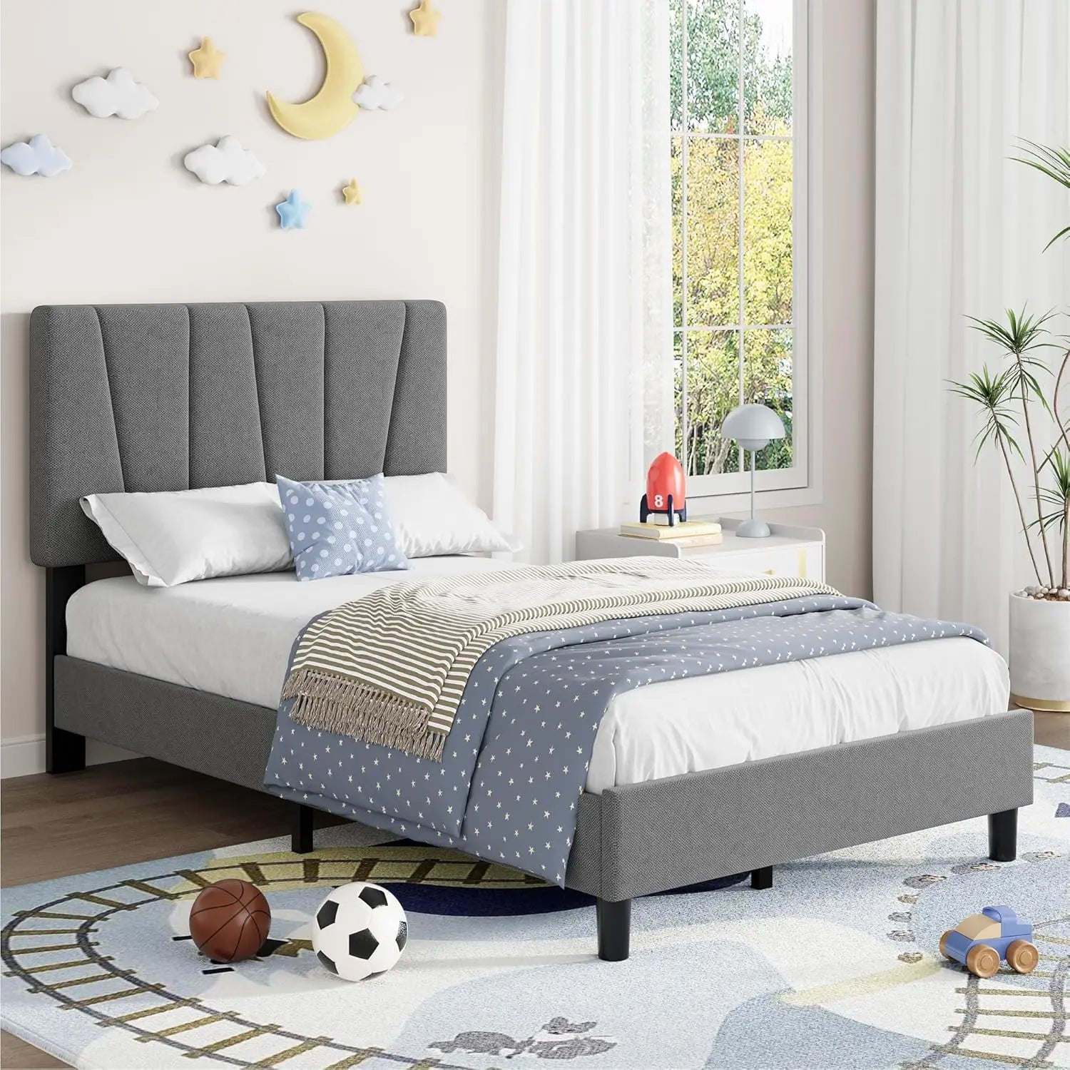 Suitable for bedroom use with a twin mattress. The upholstered headboard provides a soft surface for sitting up in bed. The adjustable headboard allows for height customization. The wooden foundation supports the mattress directly without requiring a box spring. The platform design offers a low-profile bed frame option.