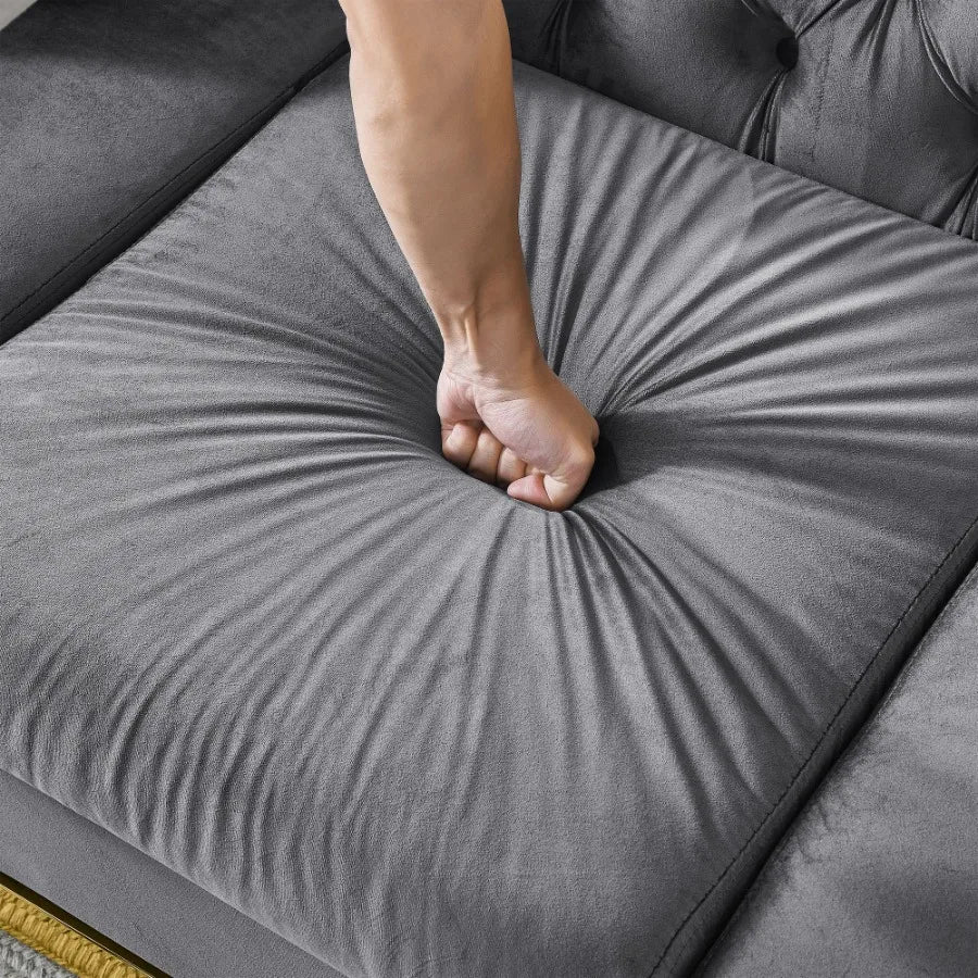 Velvet Luxury Chesterfield Sofa Set 84 Inches Tufted 3 Seat Couch with Gold Stainless for Living Room Grey Fabric